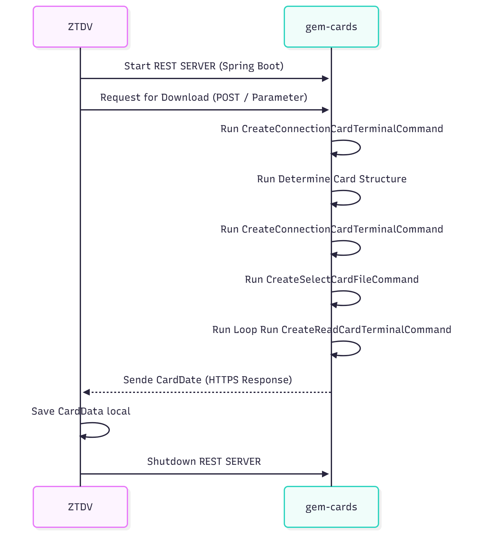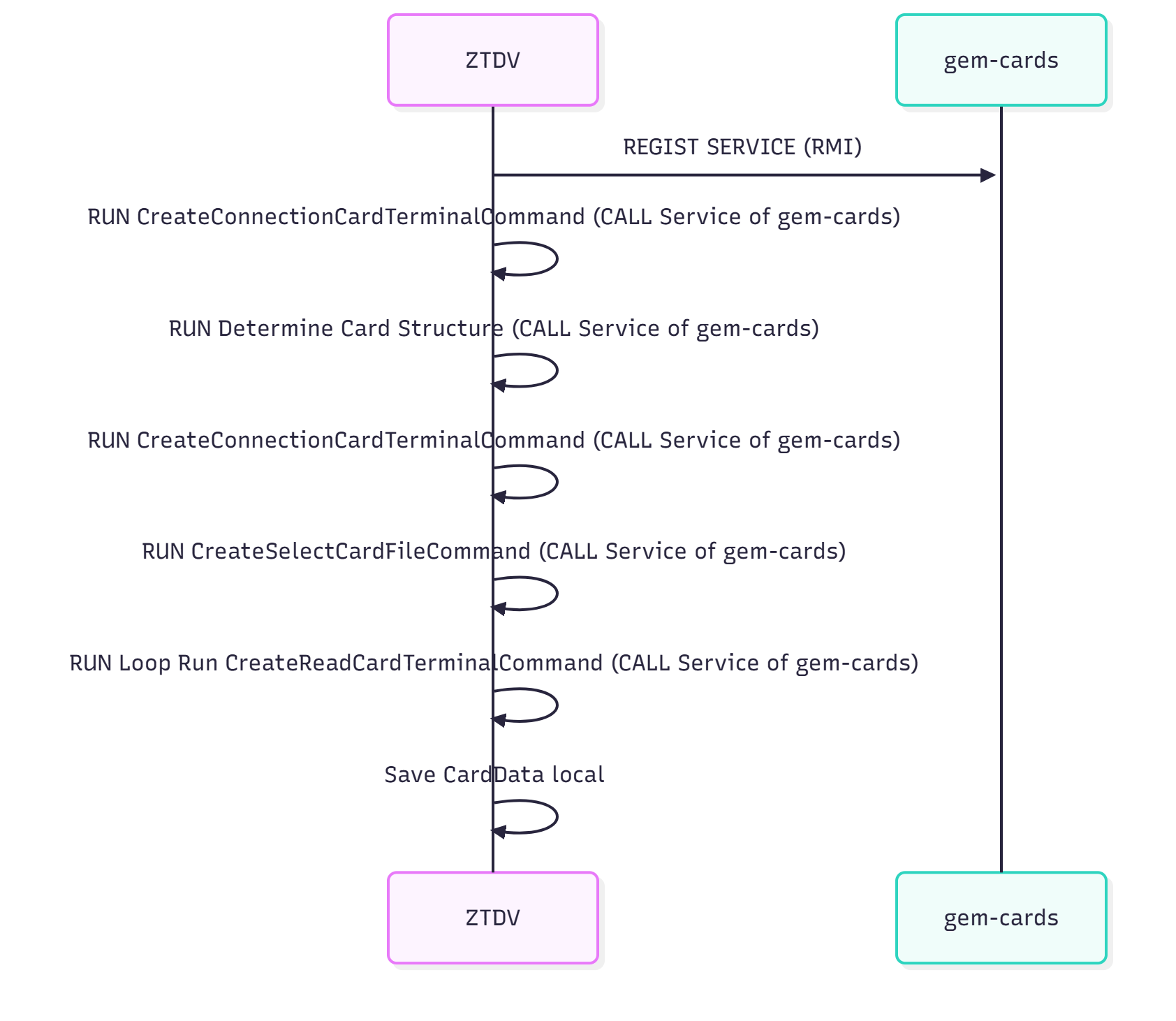 “Carddownloader” for example is a useful tool in “ZTDV”. Following figure shows the current implementation with RMI. The implementation is primarily located on the “ZTDV” side. The “gem-card” services are accessed remotely from “ZTDV”.