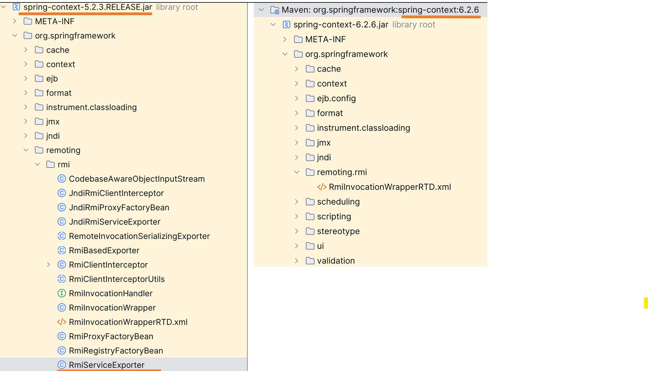 The current Spring version in project “ZTDV” is 5.3.39, with an update planned. However, Spring Framework 6.x.x and later no longer support RMI. All RMI classes have been removed in 6.x.x, as demonstrated by comparing spring-context versions 5.3.39 and 6.2.6. Consequently, the Spring Framework upgrade in the “ZTDV” project is blocked.